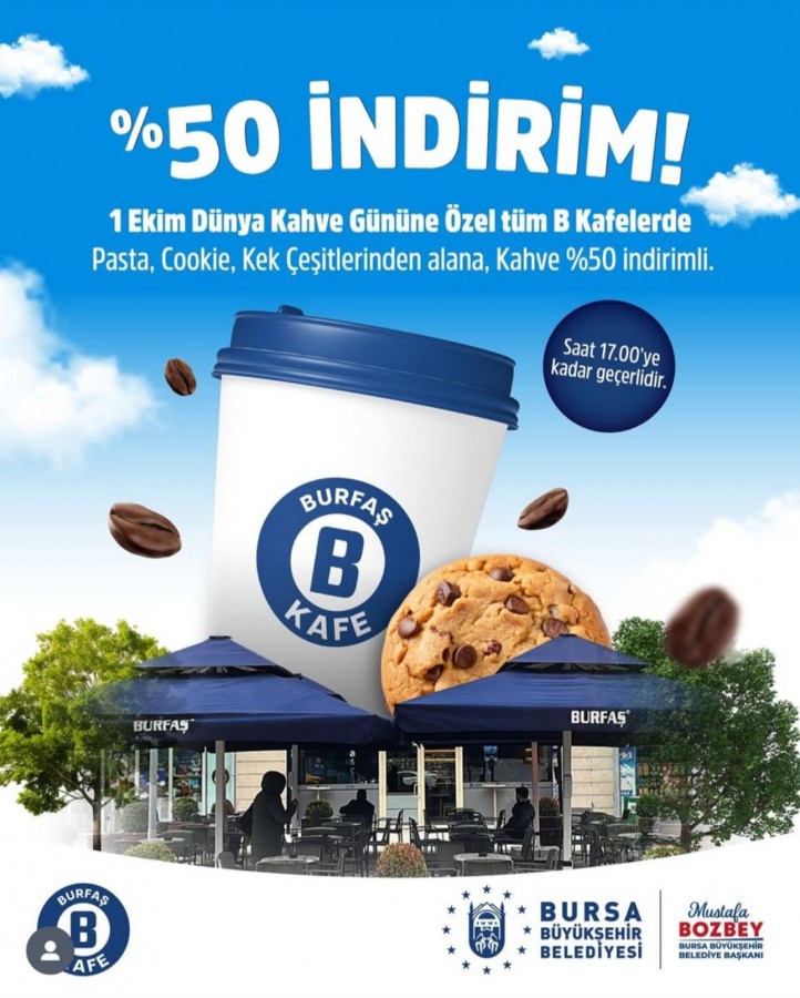 1 Ekim Dünya Kahve Günü'ne özel BURFAŞ Kafelerde pasta, cookie ve kek çeşitleri sipariş verenlere kahvelerde indirim uygulanacağı belirtildi.