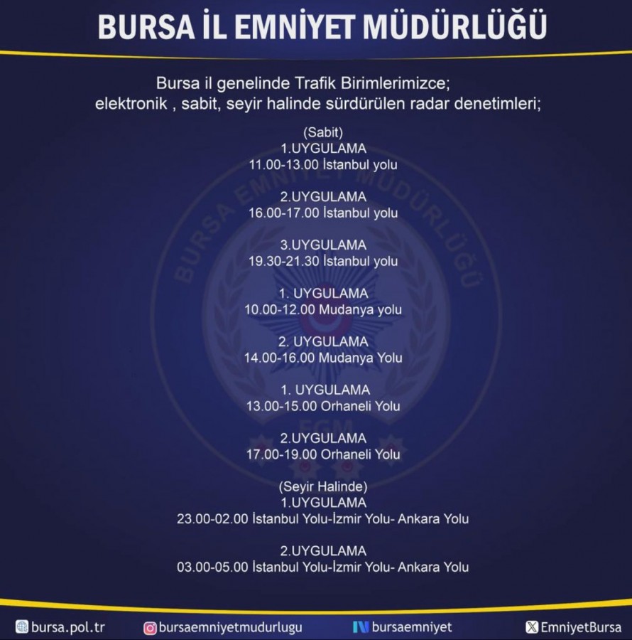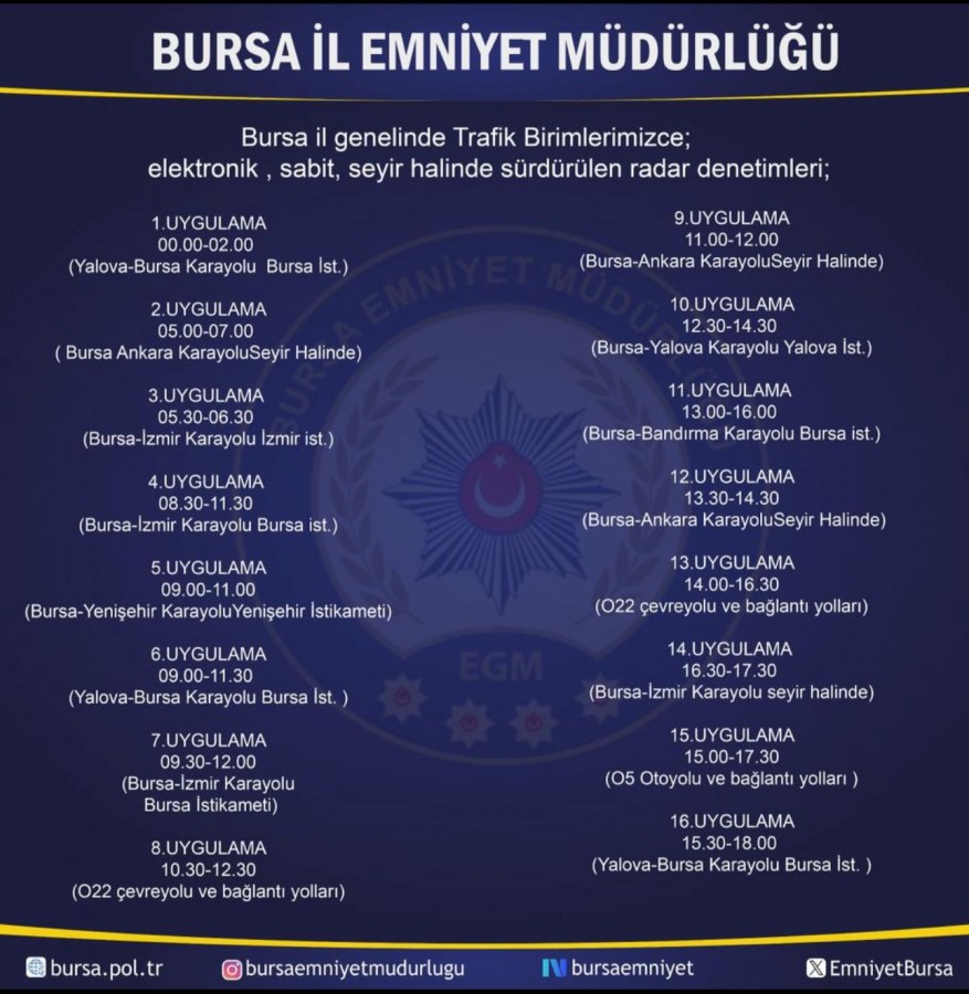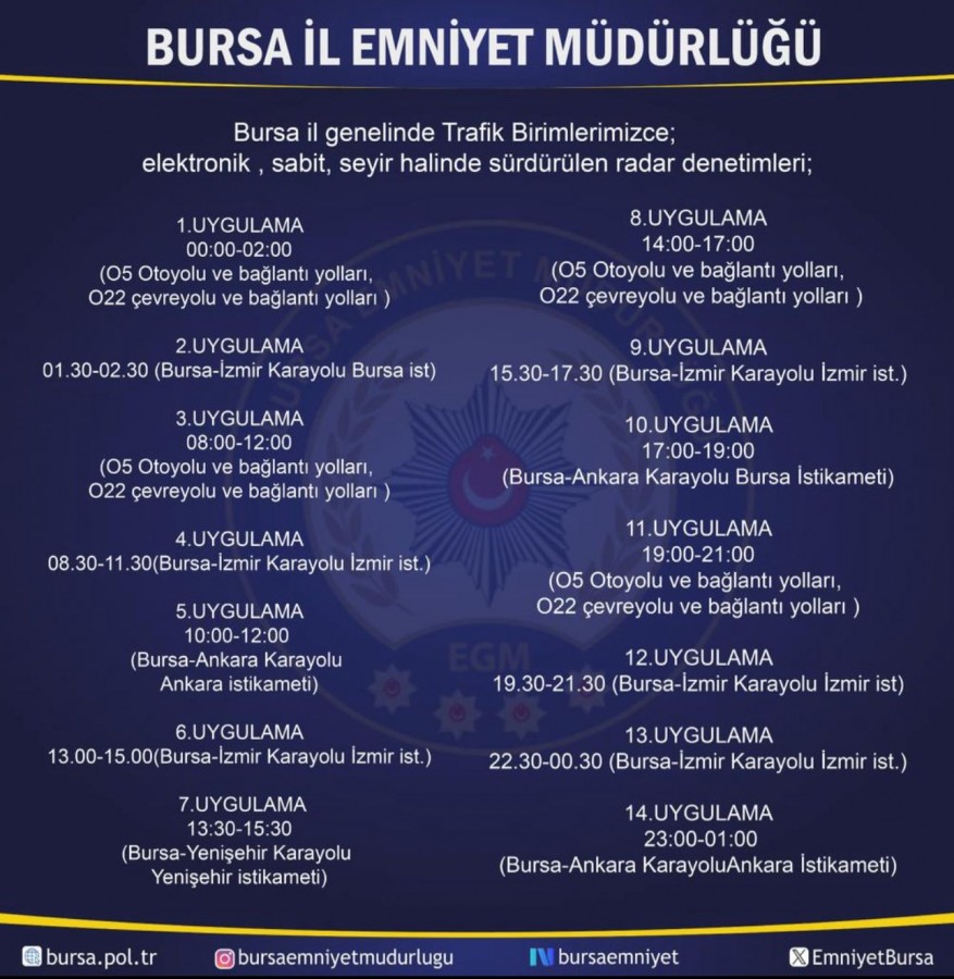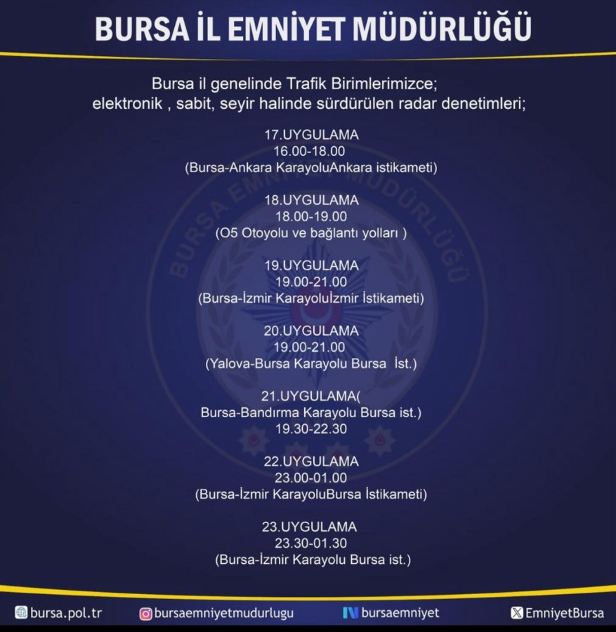 Bursa Emniyet Müdürlüğü, il genelinde elektronik, sabit ve seyir halinde yapılacak radar denetim noktalarını paylaştı.