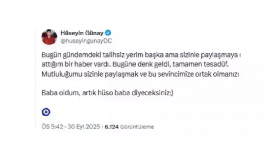 "Bugün gündemdeki talihsiz yerim başka ama sizinle paylaşmaya can attığım bir haber vardı. Bugüne denk geldi, tamamen tesadüf. Mutluluğumu sizinle paylaşmak ve bu sevincimize ortak olmanızı isterim. Baba oldum, artık hüso baba diyeceksiniz."